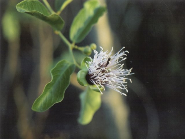 Detalhe do fruto verde aberto, da semente e da folha da planta Feijão Bravo.