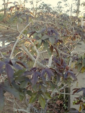 Detalhe do ramo com folhas, frutos e flor da planta Pinhão.